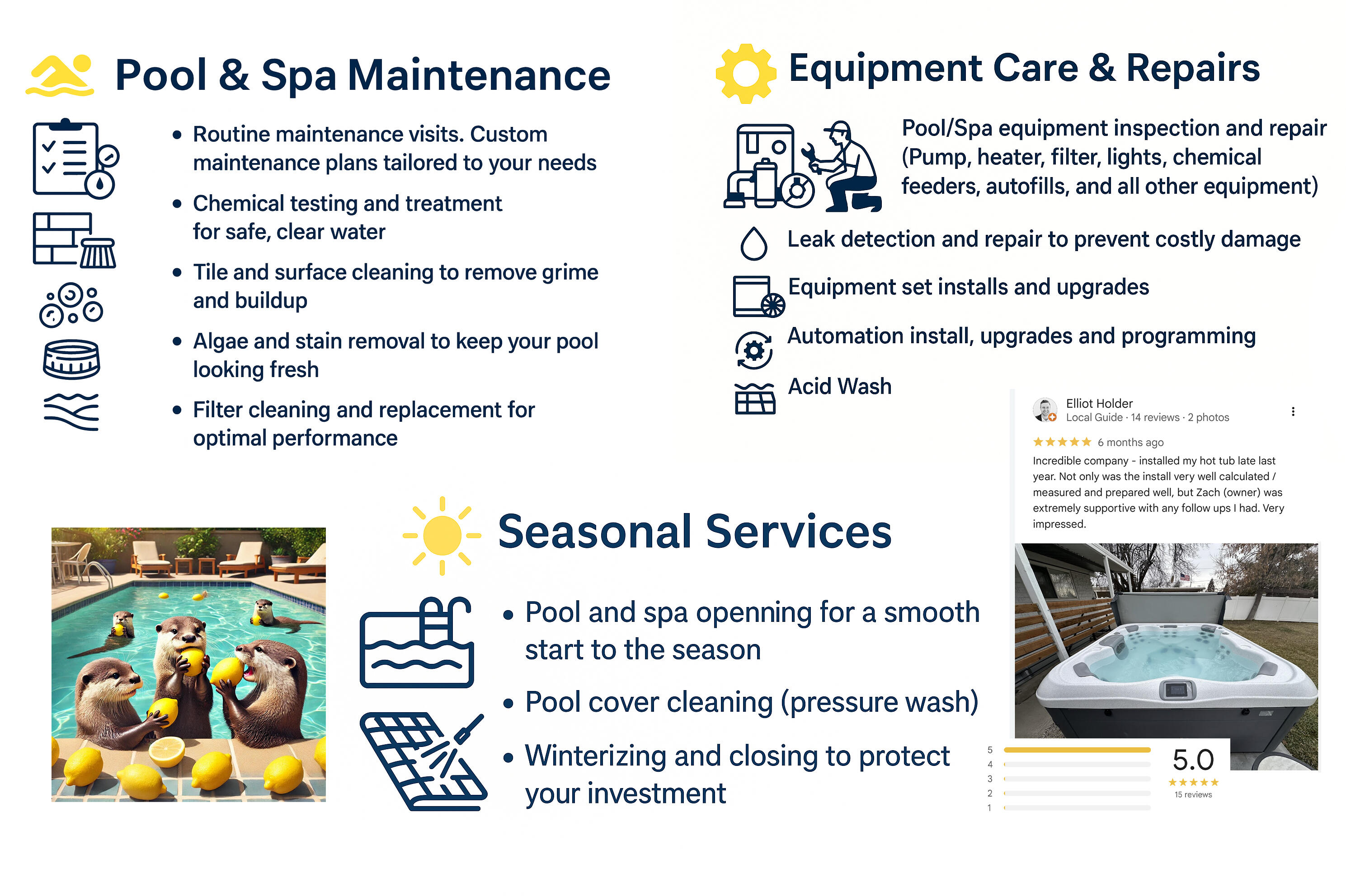 At Lemon & Otter, we make pool and spa care effortless—so you can focus on what really matters: relaxing and having fun! Whether you're soaking up the sun or unwinding in the spa, we keep your water crystal clear, your equipment running perfectly, and your stress at bay.With expert knowledge and genuine care, our team handles everything from routine cleanings to equipment repairs, installations, and upgrades. We’re all about reliability, quality service, and making sure your pool or spa is always ready for your next moment of escape.So sit back, relax, and let Lemon & Otter do the work—because every great swim starts with great care.